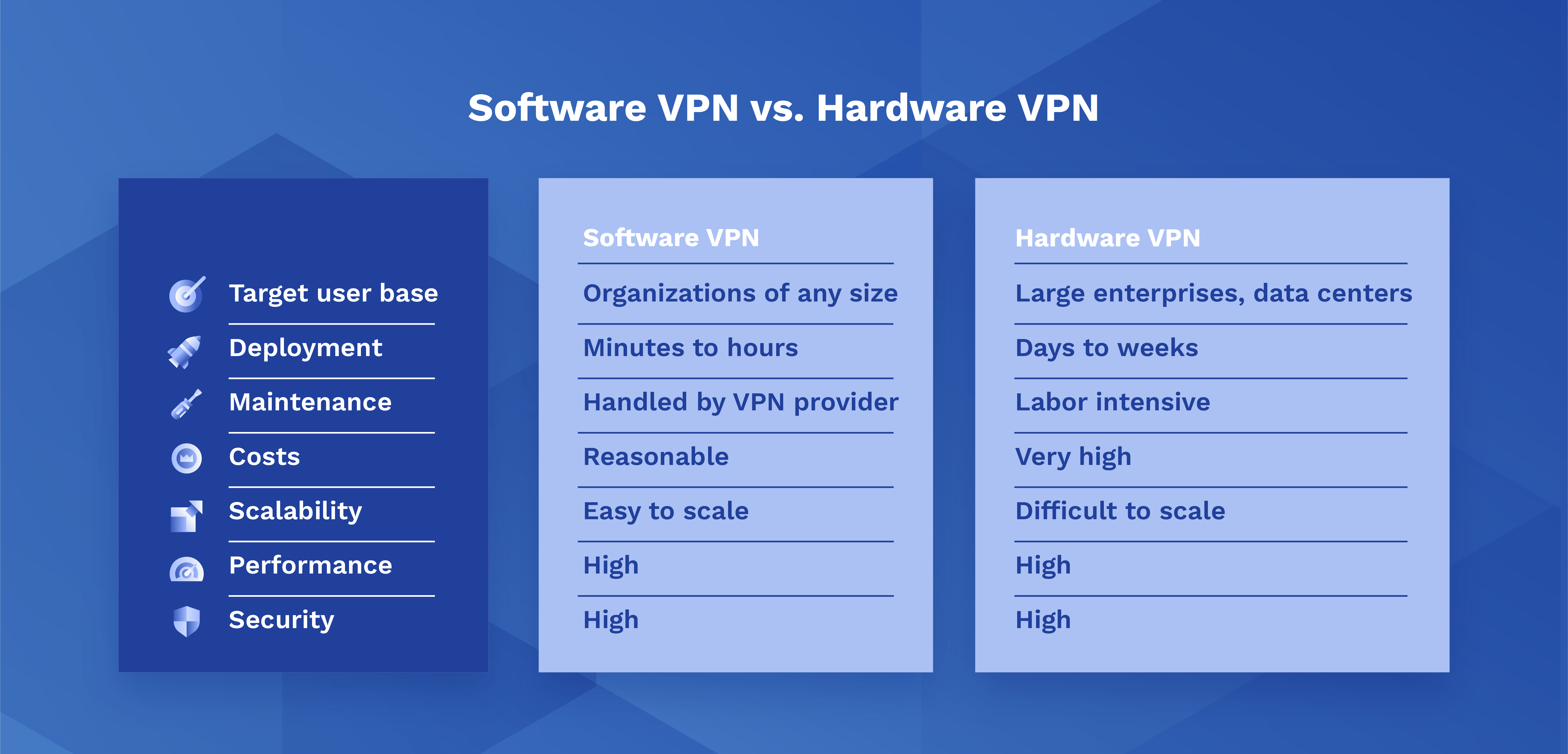 Maintenance - software updates, device management, and configurations when the need to add/remove a new user or device arises can be costly and time-consuming when done with your own internal resources. By contrast, software VPN infrastructure is maintained by the vendor so there are no additional costs associated.