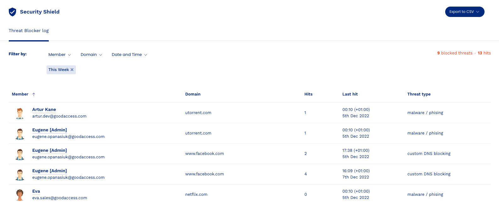 This information allows you to keep track of what threats your users are exposed to, and identify potential breaches or weak spots in your security ecosystem, or pick up content policy violations.